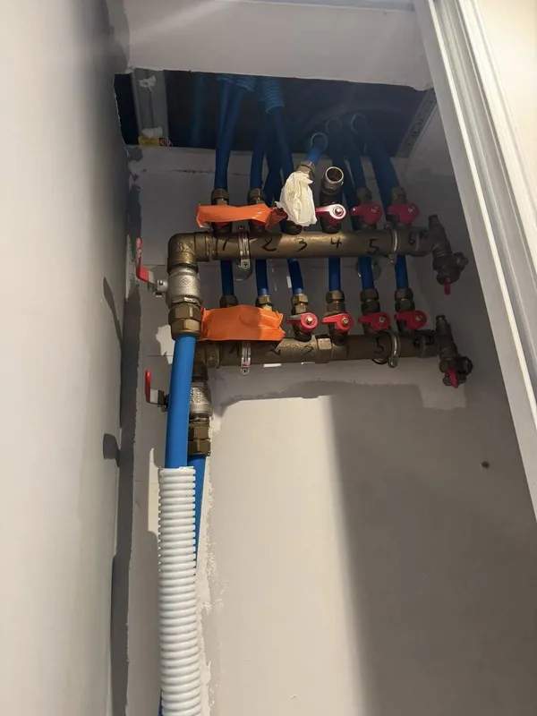 L’équipe de chauffagistes est intervenue pour effectuer un désembouage complet, suivi du remplacement des anciennes tuyauteries par du multicouche isolé et du cuivre apparent. Une nourrice fonctionnelle a également été mise en place pour améliorer la distribution.